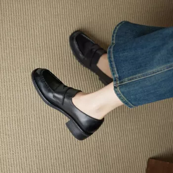 Genuine Leather Chunky Heel Loafers for Women – Versatile Round Toe Pumps